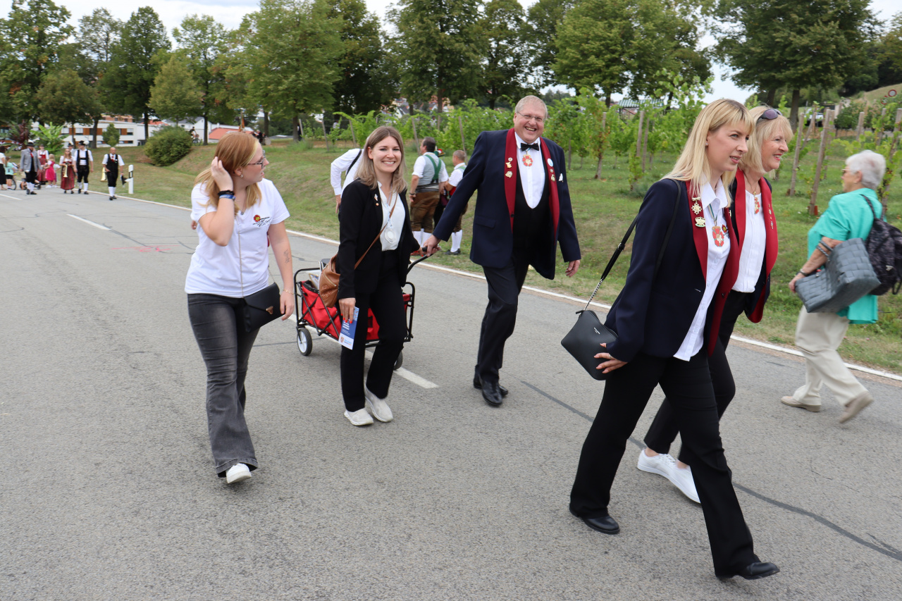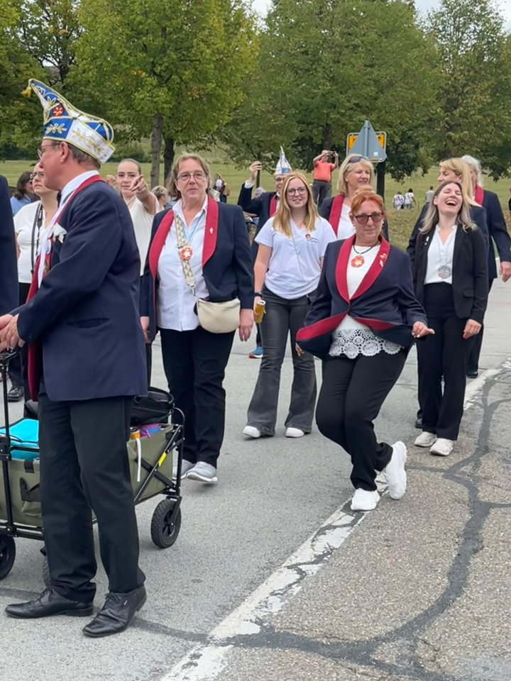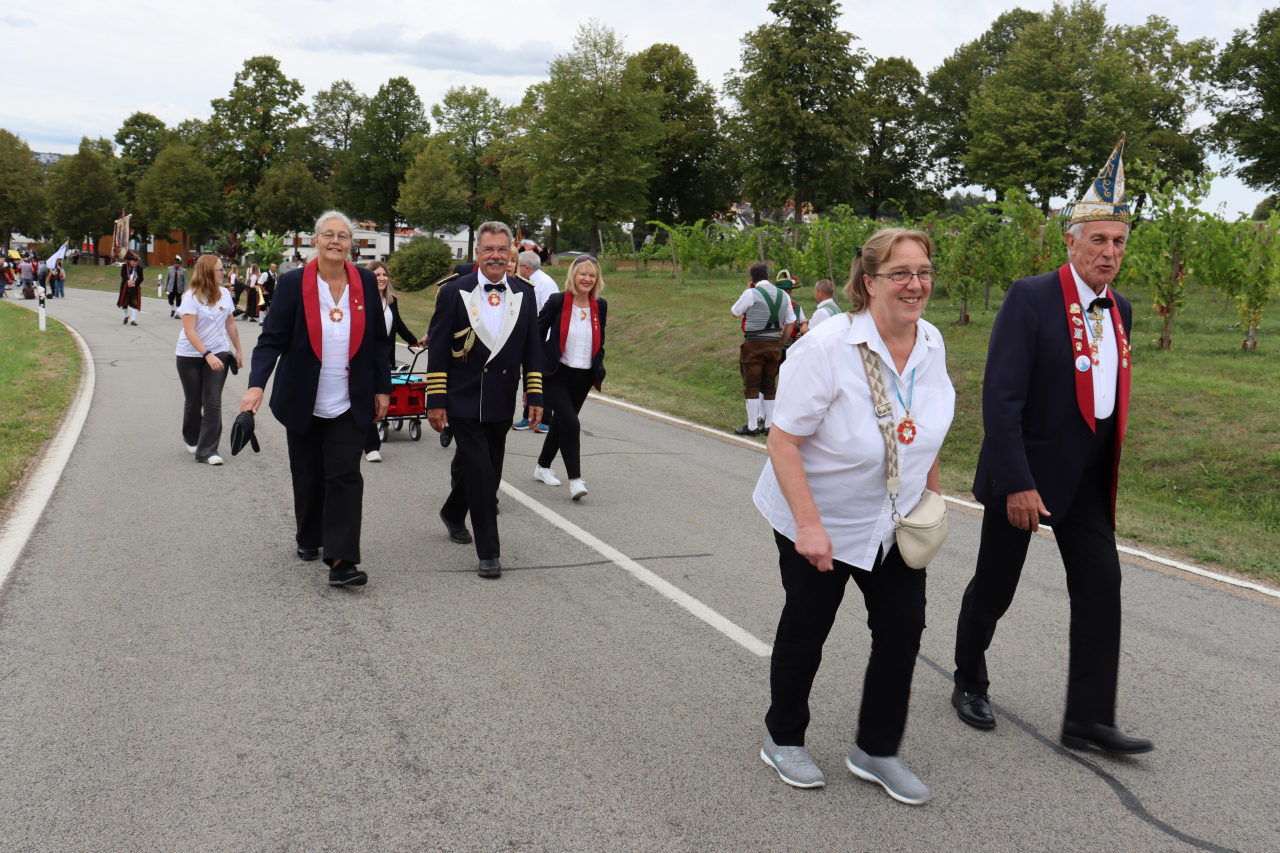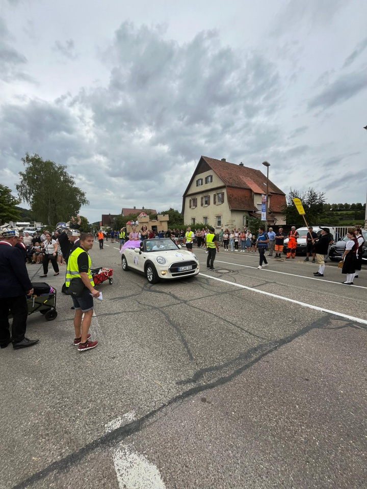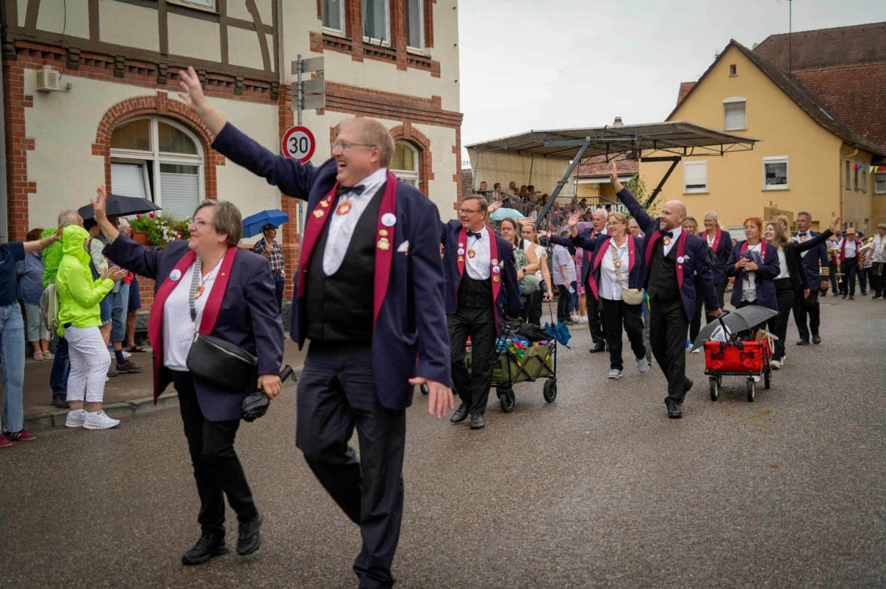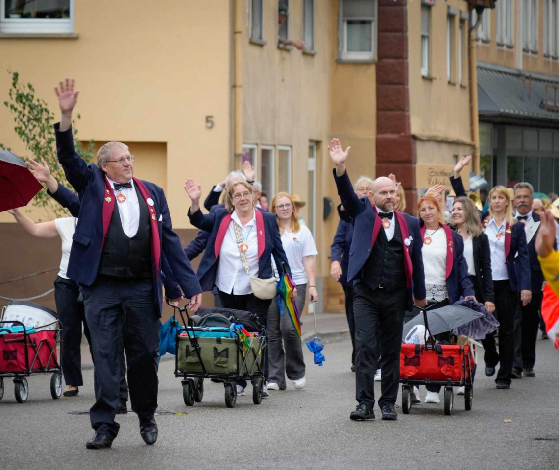 Vor der Ehrentribüne legten wir einen kurzen Halt ein und sangen gemeinsam mit Unterstützung der Stadtkapelle das „Badner Lied“. Trotz eines kurzen Regenschauers am Ende des Umzugs blieb die Stimmung ungetrübt.