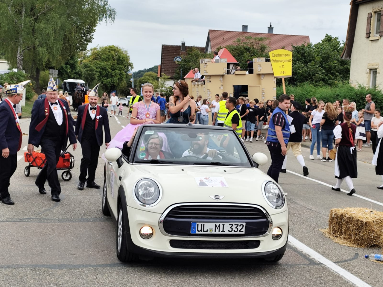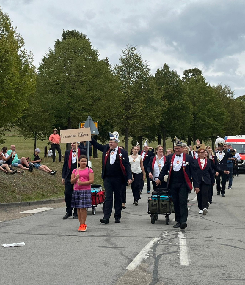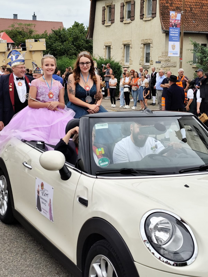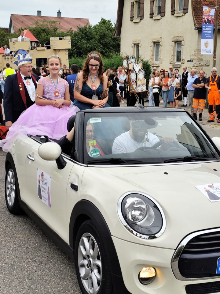 Nach einem herzlichen Empfang stärkten wir uns im Festzelt, bevor wir uns auf den Weg zu unserem Startplatz mit der Nummer 91 machten Unter dem Motto „Das Beste kommt zum Schluss“ setzten wir uns am Ende des Umzugs zusammen mit "Griechisch-Deutsche Freundeskreis PHILIA e.V." und der Stadtkapelle Weinheim in Szene und sorgten mit unserem Schlachtruf „Woinem Ahoi“ für Stimmung. Besondere Begeisterung rief unser Auftritt mit den beiden Prinzessinnen hervor, die in einem eigens organisierten Cabrio mitfuhren. Das Fahrzeug wurde von unserem Aktiven Patrick Müller über Freunde aus der Nähe von Ulm zur Verfügung gestellt. Unser Vorsitzender Andreas Kränzle führte die Delegation der KG „Weinheimer Blüten“ hinter dem Cabrio an.